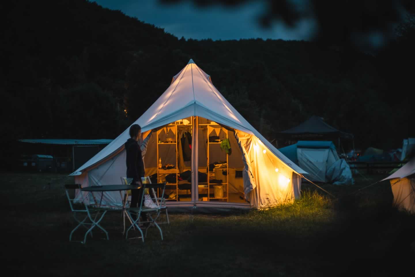 Wer kein eigenes Zelt hat oder ein wenig Komfort haben möchte, kann eines der 8 Glamping-Zelte mieten. Diese haben einen festen Boden und feste Betten. Außerdem stehen Wohnmobil-Stellplätze in der Nähe des Insel-Camps zur Verfügung.