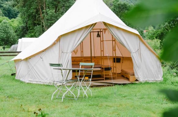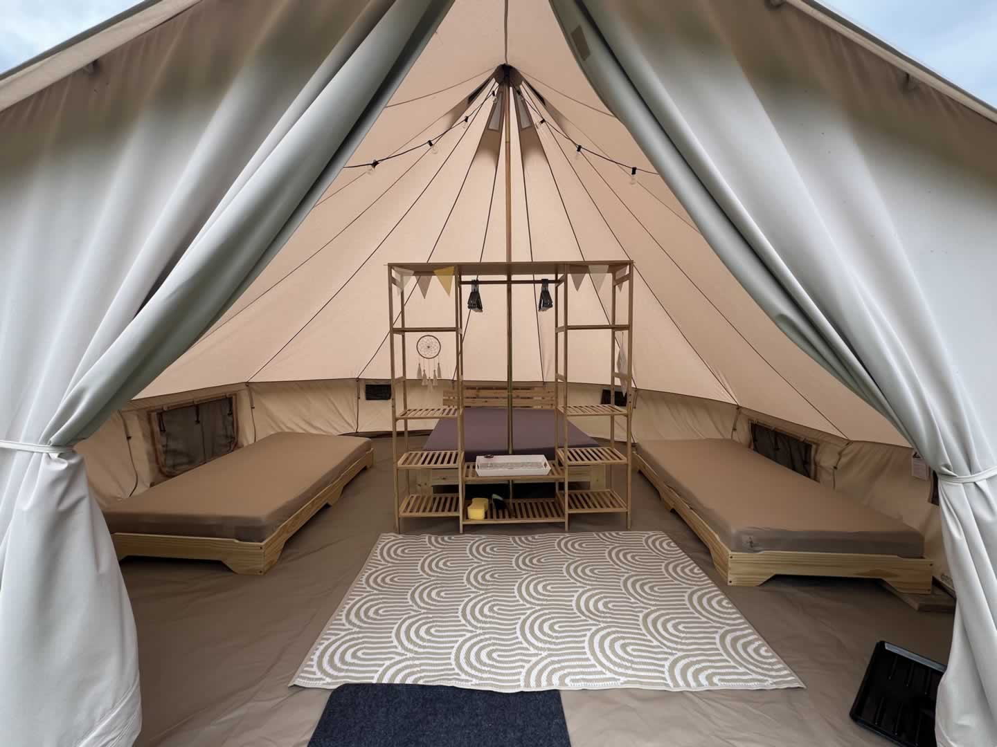 Geräumiges Rundzelt (Ø 5,2m, Höhe in der Mitte: 3m), gemütlich ausgestattet festem Boden, Betten, mit Teppich, Ablagemöglichkeit. Ab 5 Personen wird auf Anfrage ein einfaches Leihzelt zur Verfügung gestellt.