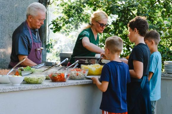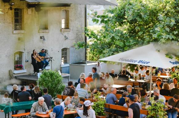 Der Biergarten „Mühlenwirt“ sorgt während eures Familienurlaubs für das leibliche Wohl. Bei schönem Wetter genießen wir die regionalen Spezialitäten, die wir gerne von kleinen Produzenten aus der Region beziehen, im begrünten Biergarten, direkt zwischen der alten Mühle und dem Fluss. An Regentagen steht ein gemütlicher Innenraum zur Verfügung. Auch eine vegane oder vegetarische Verpflegung ist möglich (bitte bei Buchung anmelden). Ein besonderes Highlight ist das fast wöchentlich stattfindende Konzert im Mühlenwirt (auf Spendenbasis), das für gute Stimmung sorgt.