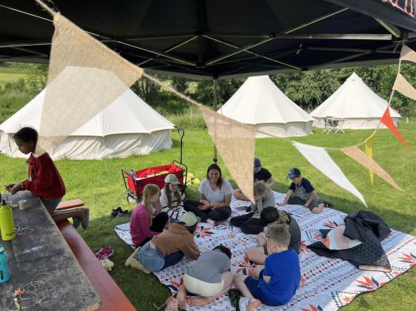 Rundzelt (Ø 4m, Höhe in der Mitte: 2,5m), gemütlich ausgestattet mit festem Boden, Betten, Teppich, Ablagemöglichkeit.