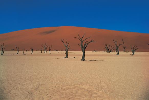 Die Zufahrtsstraße in das Sossusvlei ist geteert und bringt uns über eine 60 km lange Strecke von unserer Unterkunft bis auf 5 km an die Dünen heran. Von einem großen Parkplatz aus fahren wir in 4x4 Geländewagen über Sandwege bis zur Pfanne im Sand und besuchen das beeindruckende Dead Vlei. Im Dead Vlei liegt das Ende des Trockenflusses Tsauchab und "Big Daddy", die scheinbar weltweit höchste aller Dünen. Die Landschaft ist vor allem geprägt durch abgestorbene Kameldornbäume. Allgemein gibt es in dieser Gegend so manch bizarre Pflanze oder Tierart, angepasst an das Leben in der Wüste, zu entdecken.