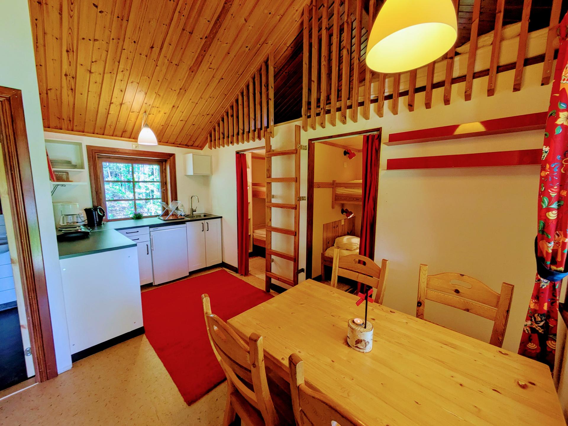 Die zehn kleinen, gemütlichen Schwedenhütten sind mit einer Pentryküche (Herd, Kühlschrank, Kaffeemaschine, Wasserkocher), WLAN, DU/WC und Sitzecke ausgestattet. Vor den Häusern kann man es sich auf der Veranda gemütlich machen. In zwei kleinen Schlafkammern steht jeweils ein Etagenbett. Wer möchte, kann auch im Alkoven über den Schlafräumen, wo zwei weitere Matratzen nebeneinander liegen, übernachten.