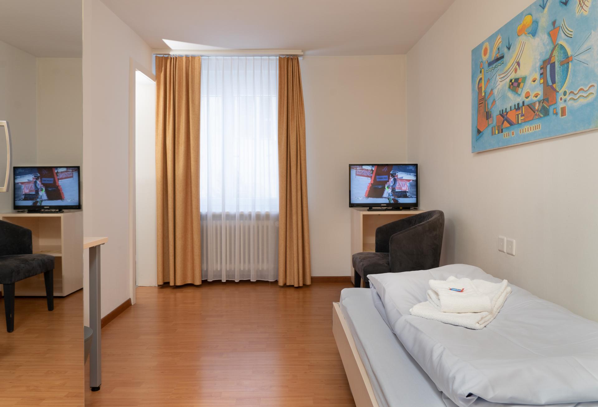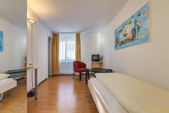 Die Zimmer der Kat. B "zur Alleinbelegung (1 Pers.)" verfügen über Einzelbett und eine Schlafcouch. Achtung: die Zimmer der Kat. B zur Dreierbelegung verfügen über ein Stockbett und Einzelbett.