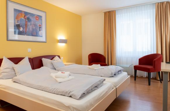 Wir bieten auch sog. halbe Doppelzimmer an. Bei Buchung eines Doppelzimmers belegst du das Zimmer mit einem zweiten Gast deines Geschlechts und sparst damit den Einzelzimmerzuschlag.