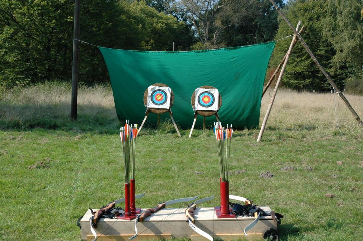 Wir bauen den Übungsplatz direkt auf dem Gelände in der Lauheide auf. Hier haben wir viel Platz für die großen Scheiben, zwei Bahnen und verschiedene Entfernungen. Die Recurvebögen, mit denen Erwachsene und Jugendliche schießen, zeichnen sich durch unterschiedliche Zuggewichte aus. Kinder erhalten leichtere Kinderbögen.