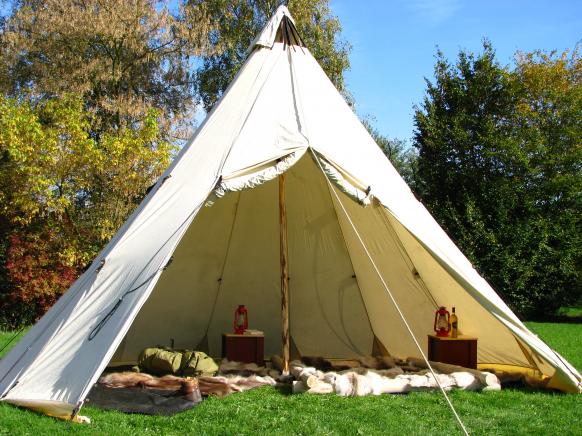 Jedes Tipi bietet Platz für maximal vier Personen. Der Boden ist mit einer Plane und drei Bastmatten bedeckt. Eine LED-Laterne spendet gemütliches Licht. Auf den drei kleinen Tischchen könnt Ihr Eure Lieblingsbücher ablegen. Drei Wildnisbetten mit rustikalem Rundholzrahmen, dicken Luftmatratzen, Hygieneauflagen und einem Rentierfell passen ins Zelt und sehen „nice“ aus. Eine Luftmatratze findet als Zustellbett auch noch Platz.