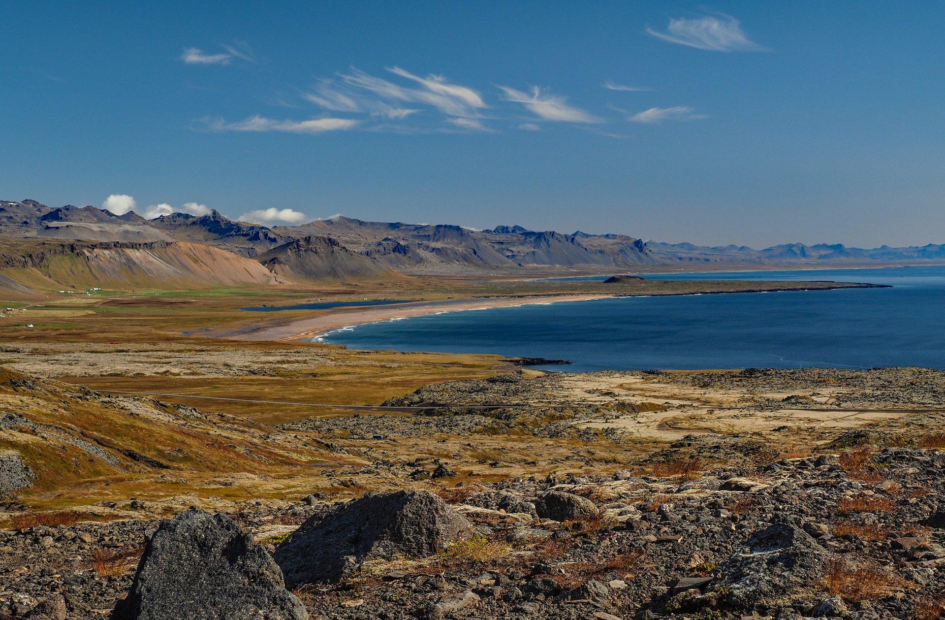 Bei einem ausgiebigen Frühstück lernen wir uns und die bevorstehende Reise kennen. Dann brechen wir auf, durchqueren die weiten Lavafelder der Reykjanes-Halbinsel und passieren die Vororte von Reykjavík, wo wir für die kommenden Tage einkaufen. Anschließend durchqueren wir den zentralen Westen Islands. Unsere erste Wanderung führt uns nördlich des Borgarfjörður zum alten Vulkankrater Eldborg. Bei guter Sicht kann man von hier aus die gesamte Südküste der Snæfellsnes-Halbinsel überblicken. Gegen Abend erreichen wir unsere Unterkunft auf der langgezogenen Halbinsel, die wir am nächsten Tag erkunden.