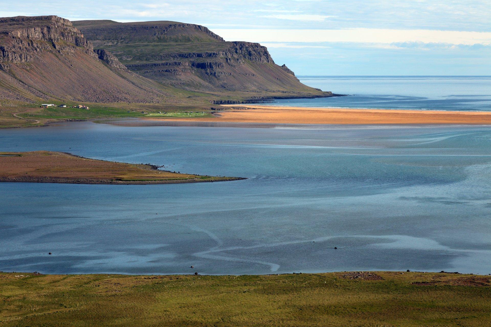 Unser Weg führt nach Norden durch die Welt der äußeren Fjorde. Auf dem schmalen Küstensaum schmiegen sich einige Farmen und die wenigen Fischerorte eng an die mächtigen Basaltplateaus. Das im Sommer sehr beschauliche Bild birgt im Winter große Lawinengefahr. Viele Farmen sind bereits verlassen. Auf der gesamten Strecke ergeben sich immer wieder weite Ausblicke und tiefe Einblicke in die Fjordwelt. Am Ende des Arnarfjörður stürzt der pittoreske Wasserfall Dynjandifoss in Kaskaden die Felsen hinab.