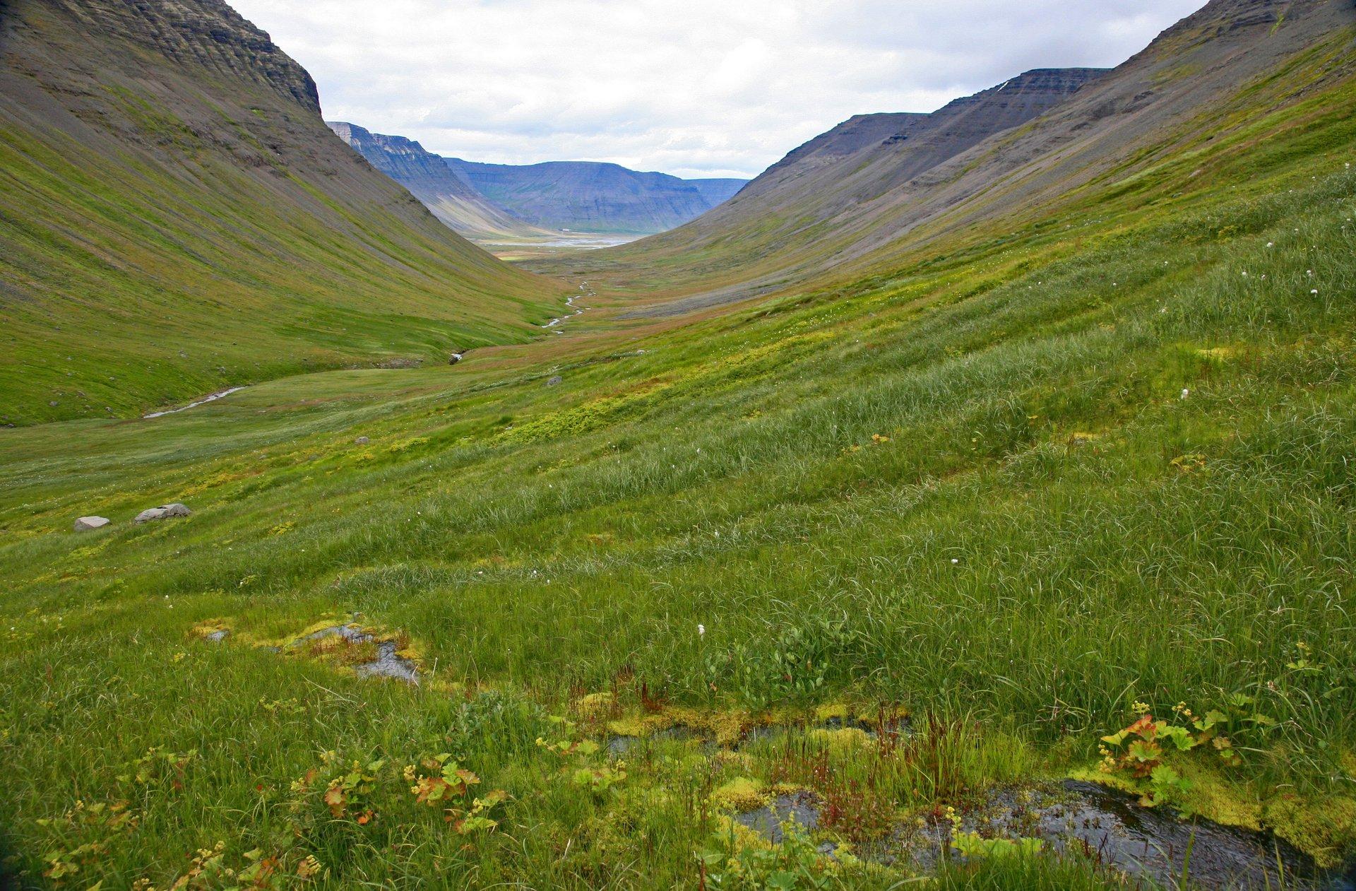 Unsere heutige Wanderung beginnt direkt vor unserer Haustür. Auf alten Handelspfaden wandern wir tief ins schöne Korpudalur, das grüne Herz der Westfjorde. Unterwegs bekommen wir ein gutes Gefühl für die mächtigen Basaltplateaus und die weiten Trogtäler dieser Region. Von der Passhöhe Álftafjarðarheiði aus genießen wir den weiten Blick über die Fjordregion und stärken uns für den Rückweg. Abends lockt ein heißes Bad im Hot Pot des schönen Schwimmbads von Suðureyri.