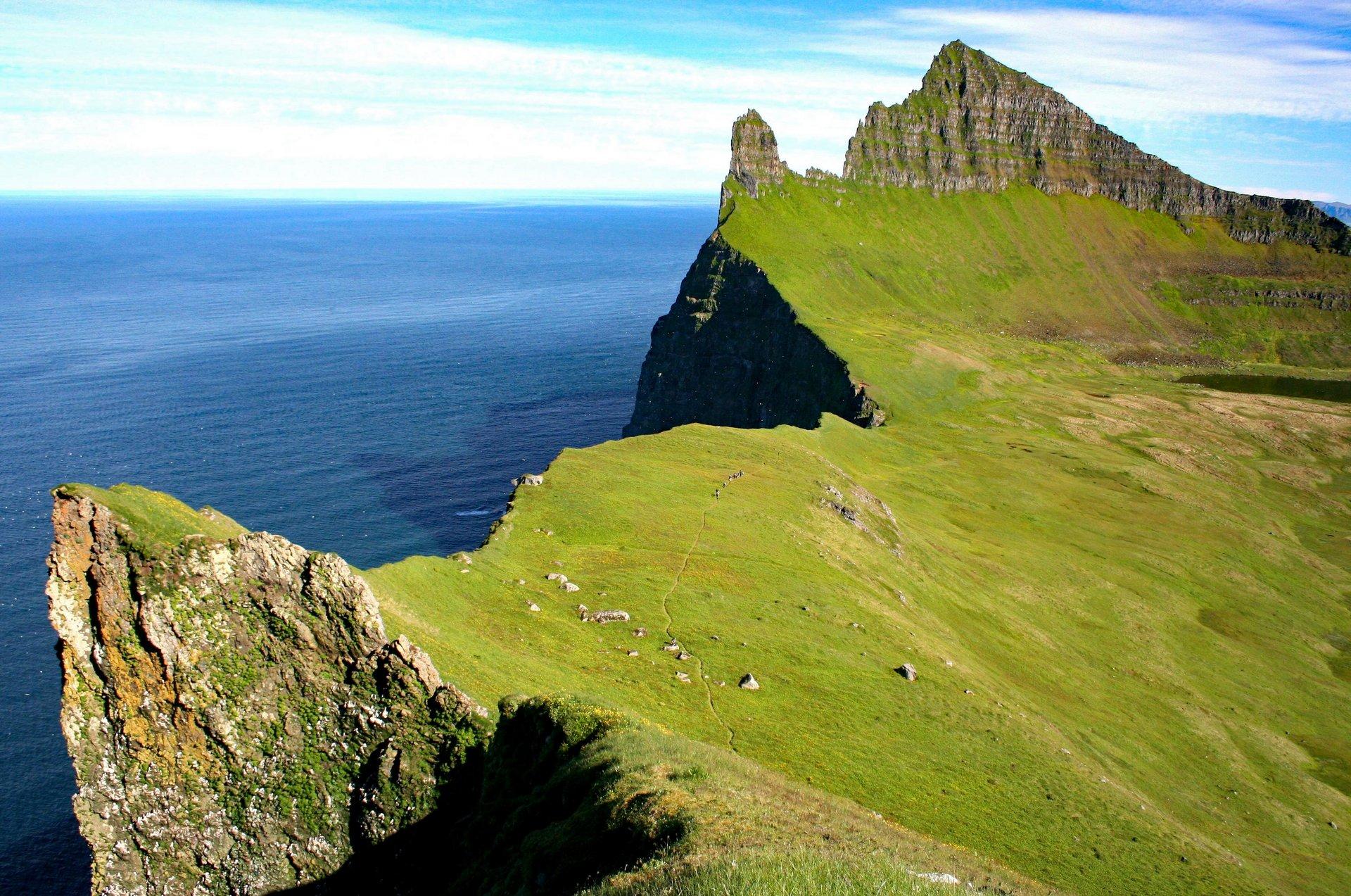 Auf dem Weg zum westlichen Ende Europas passieren wir die Ruinen der alten Fischersiedlung Hvallátur. Unwillkürlich fragt man sich, wie das Leben ohne moderne Technik in dieser unwirtlichen Region möglich war. Eine Wanderung entlang der sturmumtosten, bis zu 450 Meter hohen Steilküste Látrabjarg ist ein ganz besonderes Erlebnis. Hier spürt man die elementare Kraft des Nordatlantiks auf jedem Meter. Der 14 Kilometer lange Küstenabschnitt birgt eine der größten Seevogelkolonien der Welt.