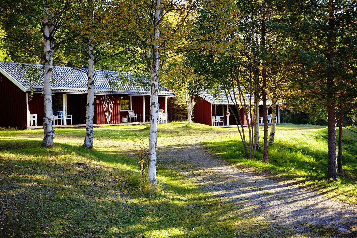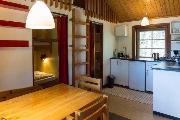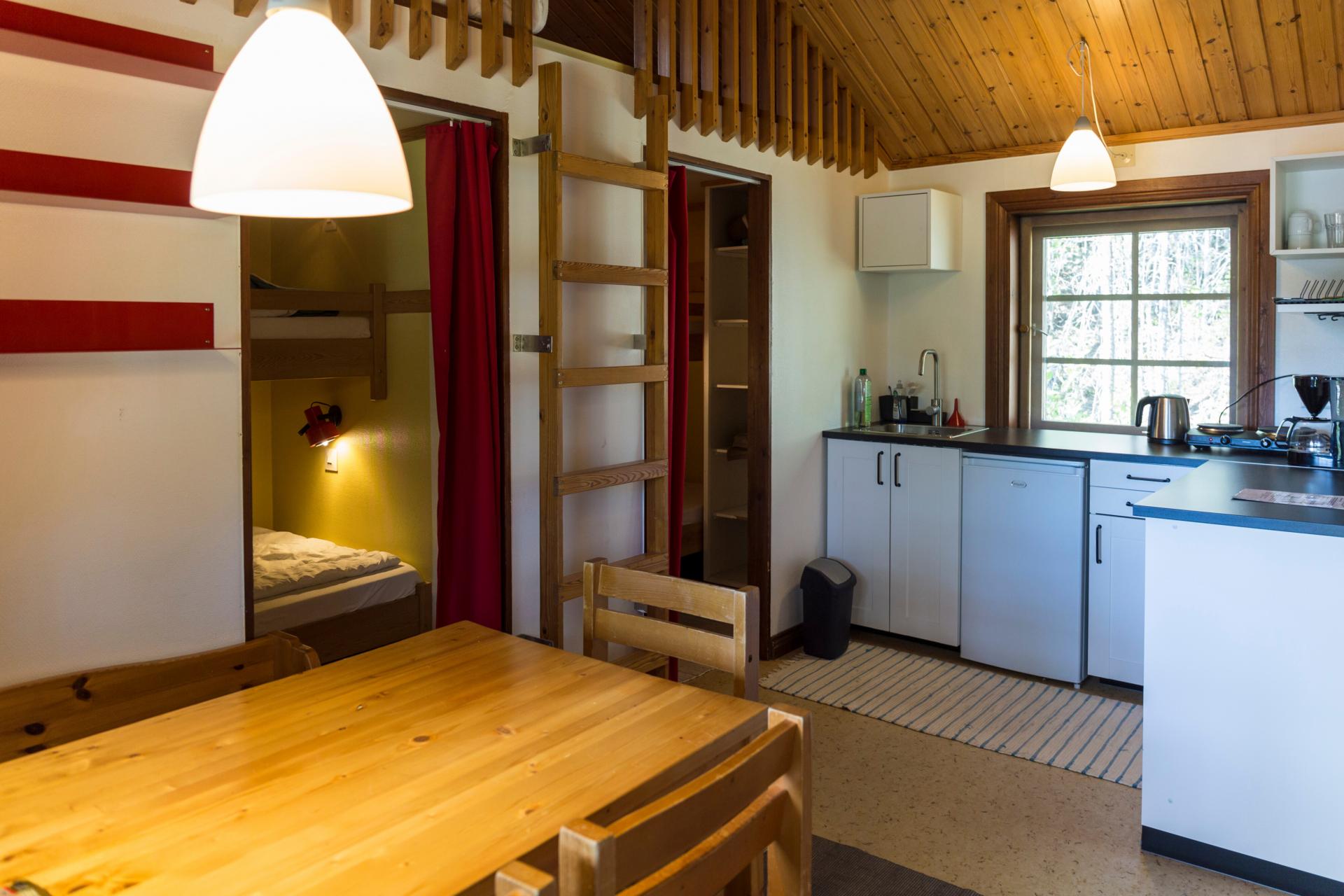 Die zehn gemütlichen Schwedenhütten bieten mit kleiner Einbauküche (Herd, Kühlschrank, Kaffeemaschine, Wasserkocher), WLAN, DU/WC und Sitzecke allerlei Annehmlichkeiten. Vor den Häusern kann man es sich auf der Veranda gemütlich machen. In zwei kleinen Schlafkammern steht jeweils ein Etagenbett. Wer möchte, kann auch im Alkoven über den Schlafräumen, wo 2 weitere Matratzen nebeneinander liegen, übernachten. Wir belegen die Häuser mit maximal 4 Personen.