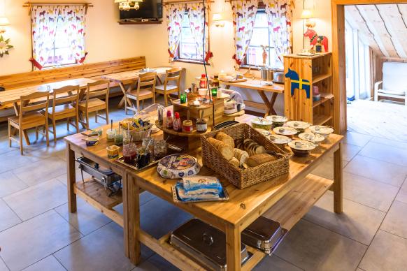 Morgens deckt das Küchenteam ein umfangreiches Frühstücksbuffet auf, das auch einige schwedische Spezialitäten bereithält. Kaffee, Tee und verschiedene Säfte sind im Preis enthalten. Vom Buffet kann sich jeder ein Lunchpaket für die Tagestouren erstellen. Am Abend bereitet der Koch bzw. die Köchin ein mehrgängiges Menü, bestehend aus Vorspeise, Hauptgericht und Dessert, zu. Selbstverständlich berücksichtigen wir auch den Wunsch nach vegetarischer oder veganer Ernährung.