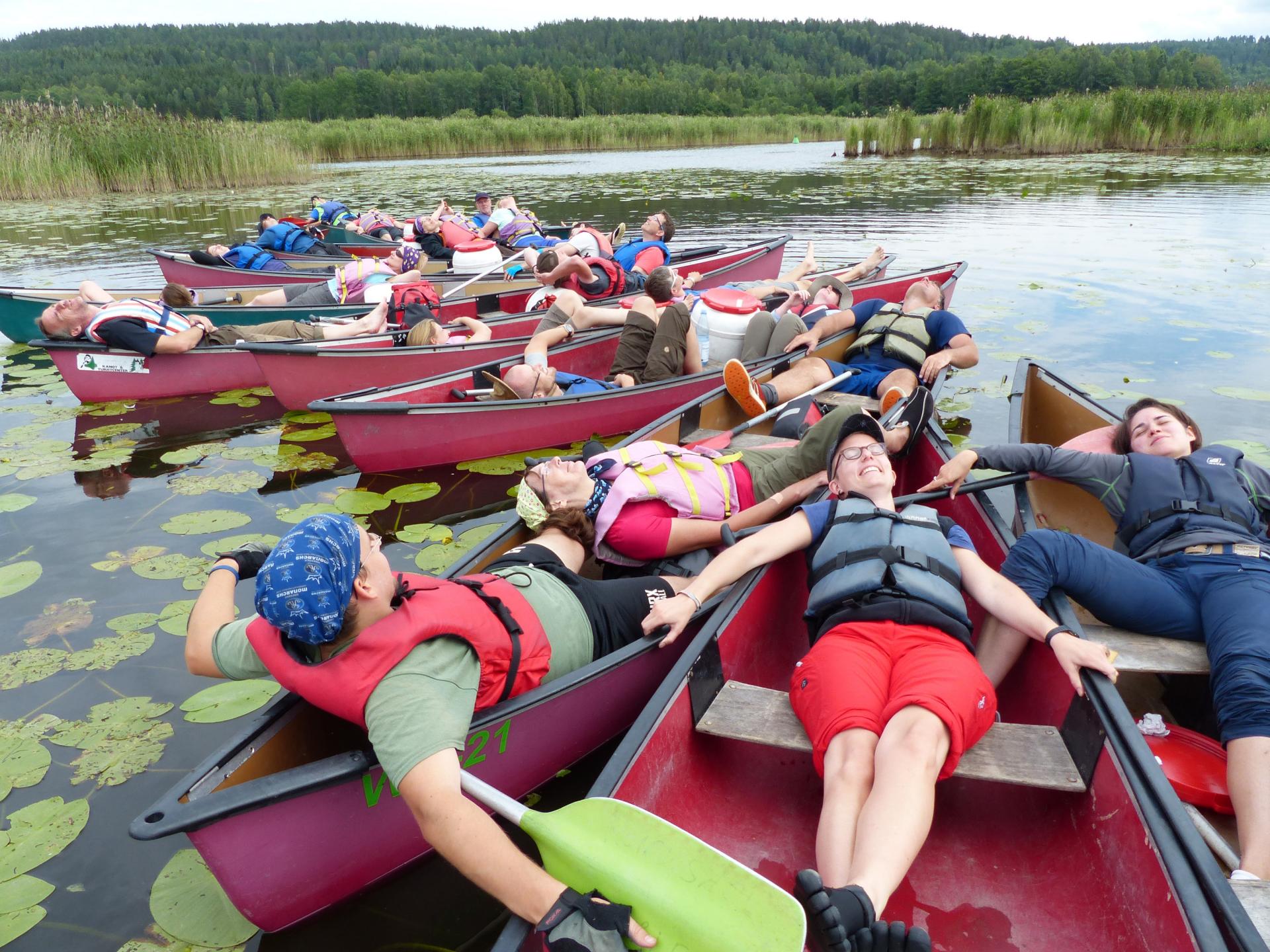Sonntag: Heute geht’s aufs Wasser! Nach einer kurzen Einführung in die Paddeltechnik erkunden wir den Stömne-See und suchen uns zum Mittags-Kaffee einen schönen, sonnigen Lagerplatz. Ein idealer Start, um uns mit dem Kanu und den Gewässern in der Umgebung vertraut zu machen. Wer möchte, kann auch unsere SUPs mal ausprobieren. Die Teamer erklären, wie man sicher auf dem Board steht und das lange Stechpaddel führt. Den Dreh bekommt man schnell raus.