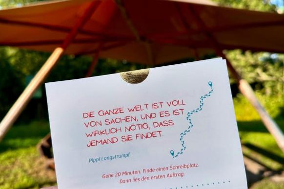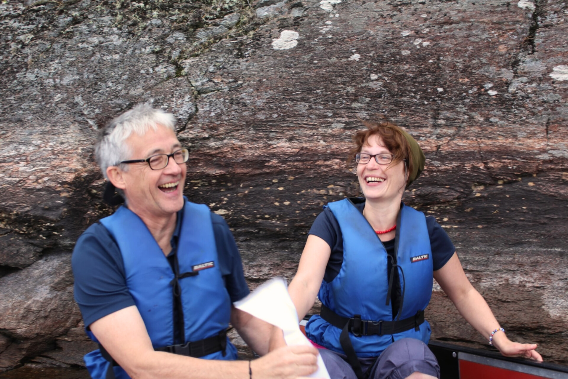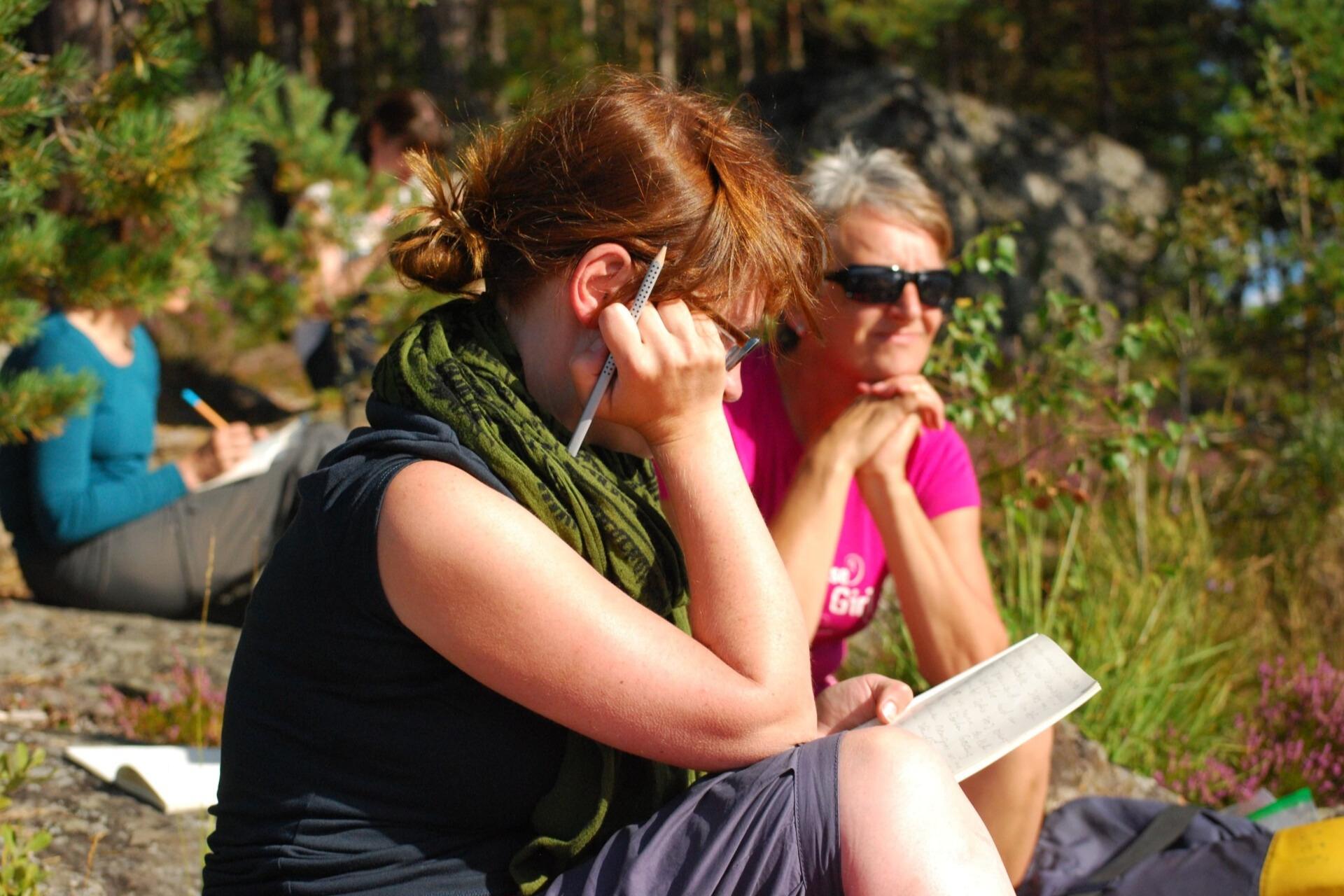 Wir schreiben, sofern das Wetter uns gewogen ist, draußen und lassen uns von der großartigen schwedischen Landschaft inspirieren. Unsere Schreibplätze sind glatte Felsen oder offene Windschutze. Wir paddeln zu winzigen Inseln, lassen unsere Füße im See baumeln oder schreiben bei einer Fika (schwedisch: Kaffeepause).